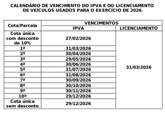 O Governo do Estado, por meio da Sefaz (Secretaria da Fazenda) e do Detran-RR (Departamento Estadual de Trânsito de Roraima), publicou no dia 24 de dezembro, no Diário Oficial do Estado (DOE), o calendário de vencimento do IPVA (Imposto sobre Propriedade de Veículos Automotores) e do Licenciamento de Veículos, para 2026.